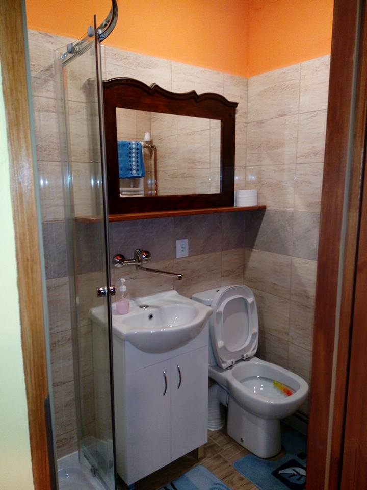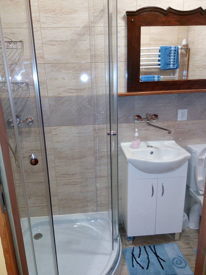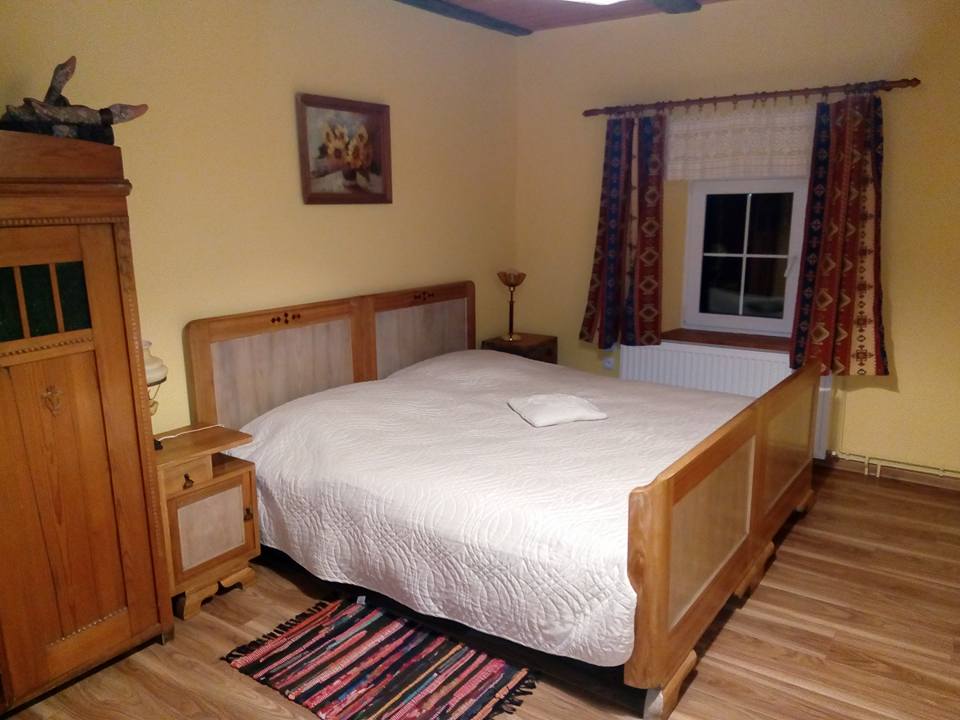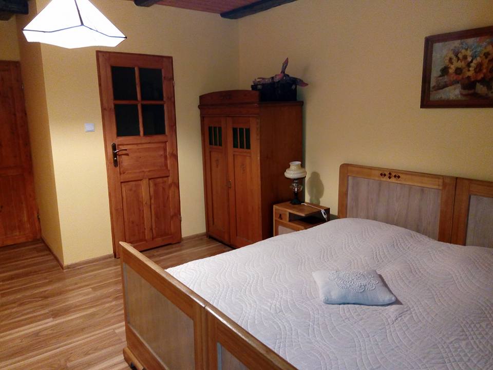 Pokój dwuosobowy z dużym łożem małżeńskim - sprężynowy materac 200x200cm z matą kokosową. Łazienka z natryskiem.