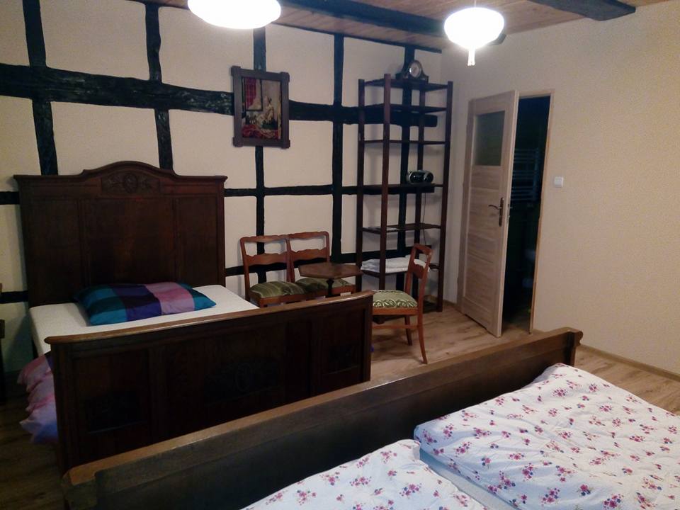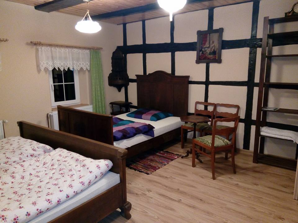 3 osobowy pokój z łożem małżeńskim ( dwa materace sprężynowe 100 x 200 ). Drugie łóżko szerokości 130 cm (materac bonnelowy z matą kokosową), może służyć jako 2-sobowe, np. dla dzieci. Okna na stronę południową, widok na gospodarstwo a w dalszej perspektywie na Karkonosze.