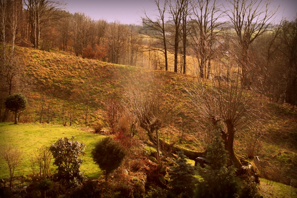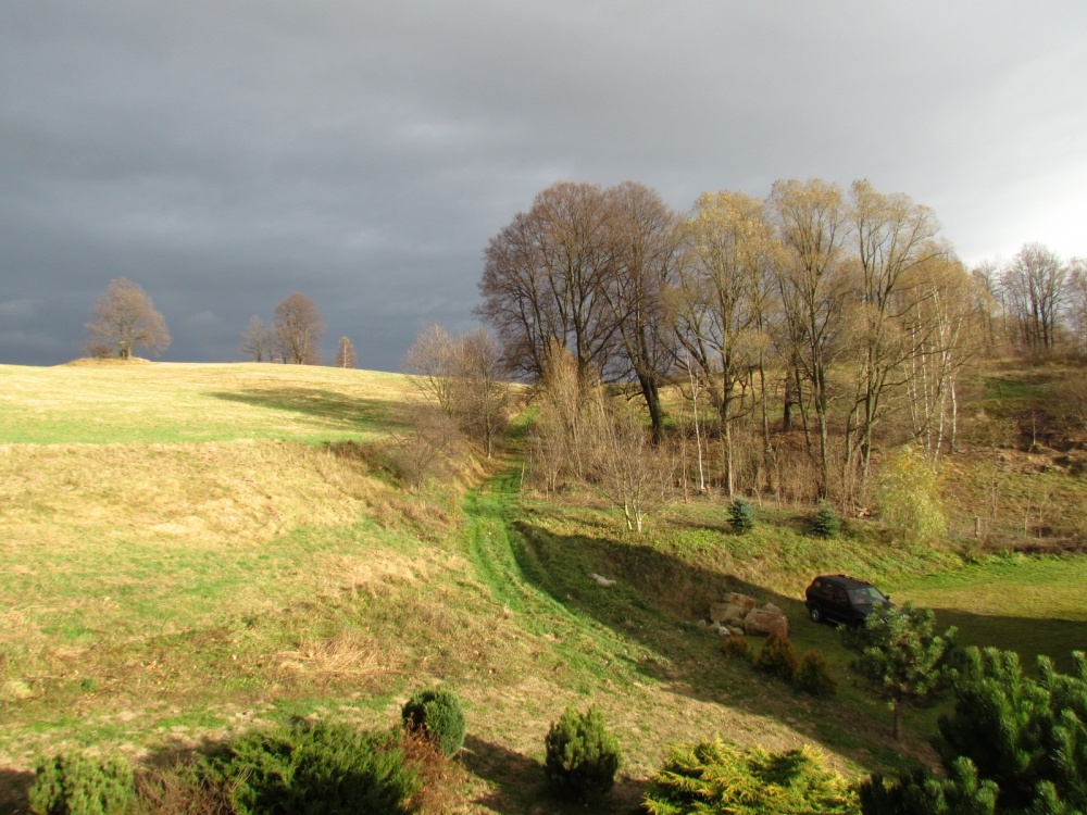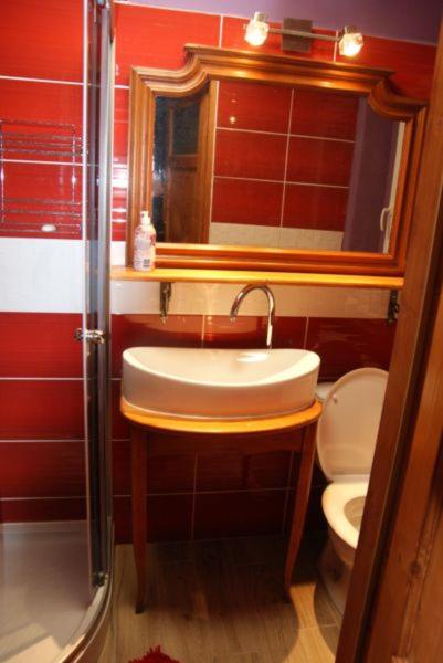 Łazienka z natryskiem. Okno na stronę południową, widok na gospodarstwo i w dalszej perspektywie na Karkonosze.